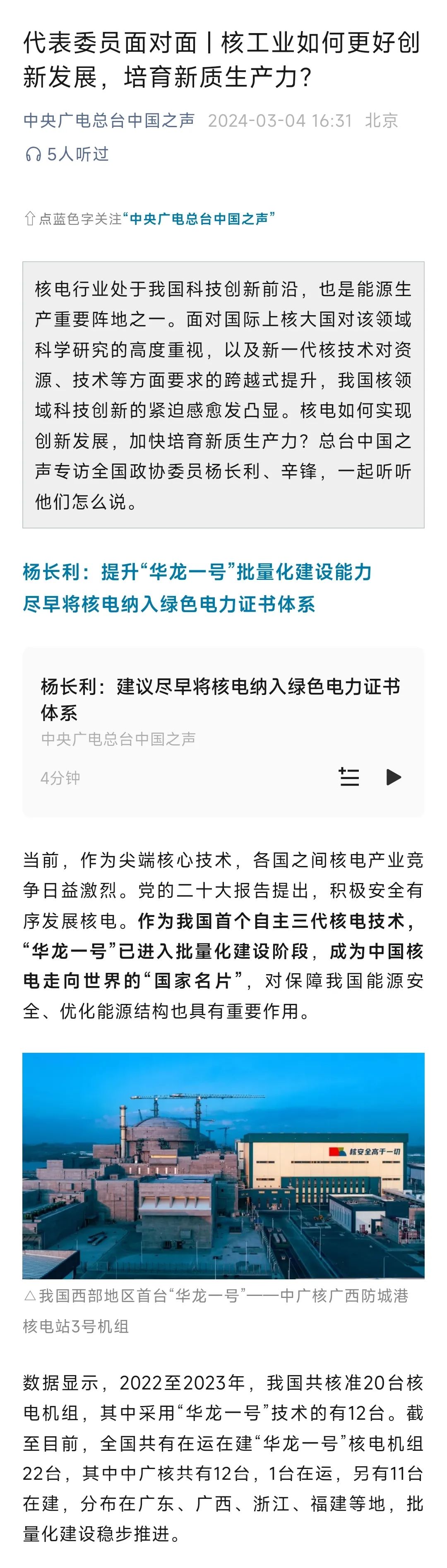 中國之聲專訪楊長利:提升“華龍一號”批量化建設能力,盡早將核電納入綠色電力證書體系